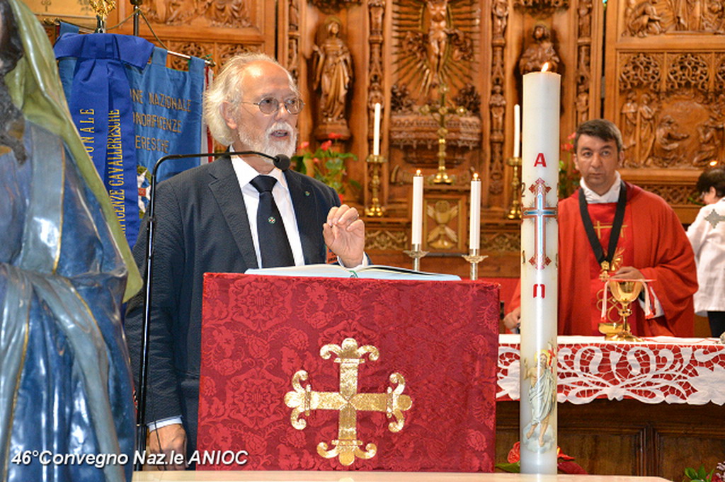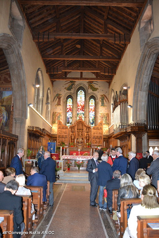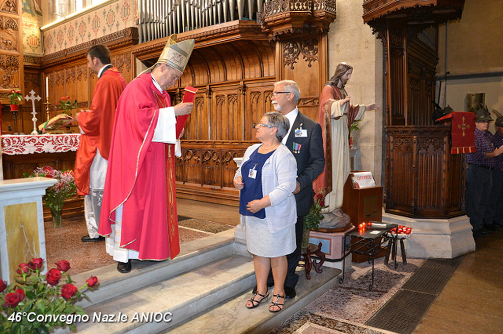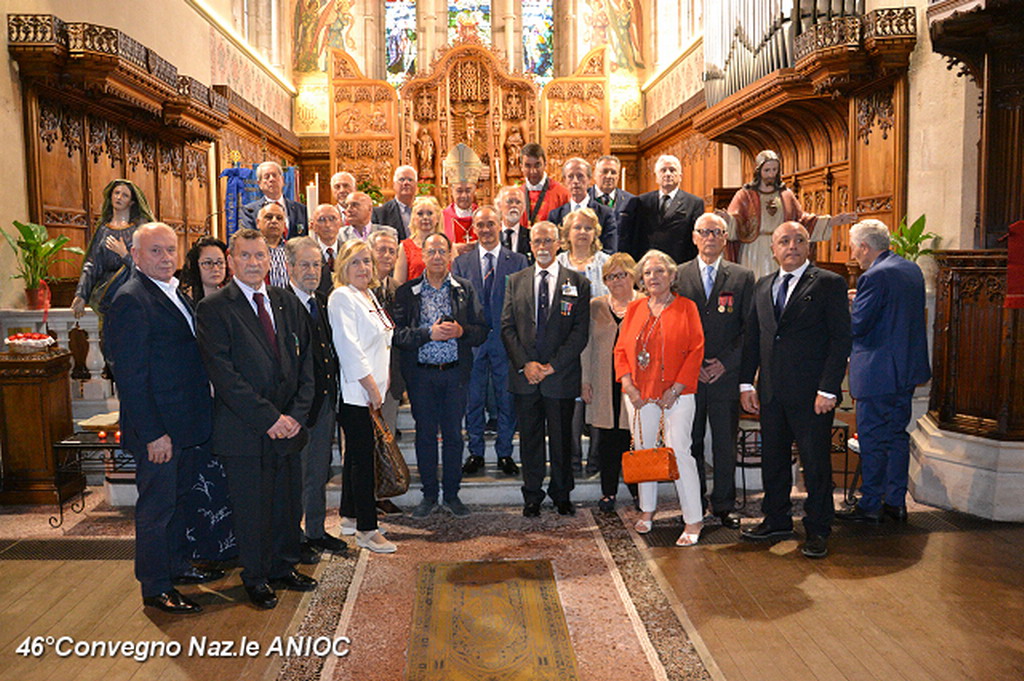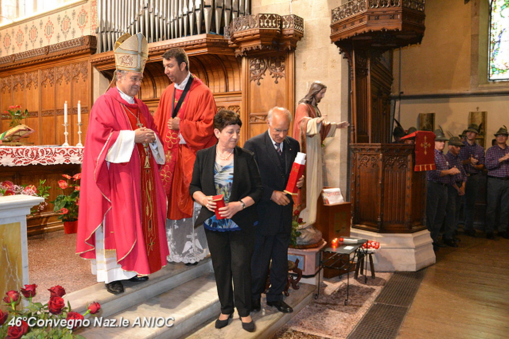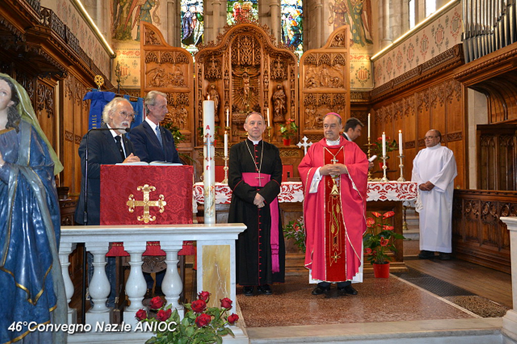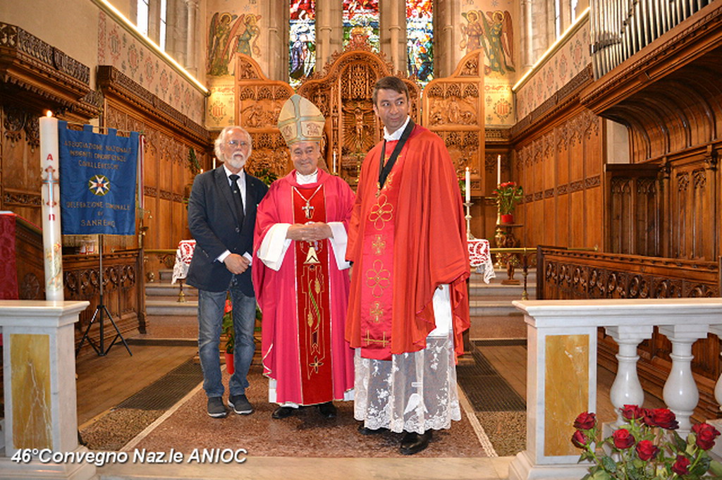 Domenica mattina, alla chiesa di Tutti i Santi, prima della celebrazione della Santa Messa, S.E. Mons Antonio Suetta, ha portato il suo saluto e augurio a tutti i partecipanti al 46°Convegno Nazionale ANIOC. Al vescovo della Diocesi di Ventimiglia-Sanremo Mons. Antonio Suetta, è stata consegnata la tessera e il diploma di Socio Onorario dal Segretario Generale Conte Maurizio Monzani e dal Delegato Prov.le Roberto Pecchinino. Ha celebrato la S.Messa, S.E. Mons. Vittorio Lupi(vescovo emerito e consulente Spirituale Regionale ANIOC) e Don Augusto Piccoli (Consulente Spirituale Nazionale Vicario ANIOC). Per l'occasione sono state consegnate delle pergamene papali per gli anniversari di matrimonio alla famiglia del Cav. Ruta Giuseppe e Pierina, al Cav. Gianni Ostanel e Mirella e al Cav. Uff. Bruno Mallamaci. Il coro Alpino Monte Saccarello, diretto dal M° Gian Paolo Nichèle, che ha animato la Santa Messa con il M° Jacopo Cassese, suonando all'antico organo settecentesco della chiesa. Presenti ala cerimonia anche i Rangers d'Italia. Al termine della Santa Messa, il Coro Alpino Monte Saccarello, ha tenuto un mini-concerto, che ha coinvolto ed emozionato tutti i presenti.