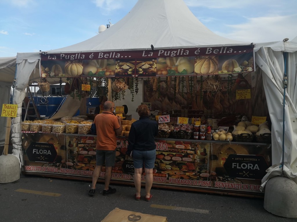 Molte le novità sulla nuova area food: non cambia solo la location ma anche la cucina si rinnova. La struttura unica lascia il posto ad un'area distribuita in modo decentralizzato: il corpo centrale sarà dedicato alla preparazione dello stoccafisso nel suo storico pentolone, alle fritture di acciughe e totani e alle cozze, mentre nelle capannine autonome verranno cucinati spaghetti al pomodoro o pesto e penne all' amatriciana. Una terza area sarà invece dedicata ai “grigliati” ovvero salsiccia, hamburger e sovra cosce di pollo, ma anche al tradizionale minestrone, alla novità del "cundijiun" e alle gettonatissime patatine fritte: il tutto condito con un eccellente olio extravergine e innaffiato da ottimo vino.
