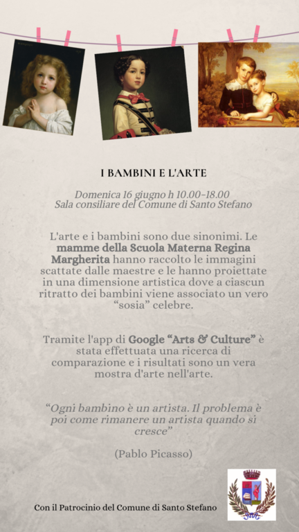 Dalle ore 10.00 presso la sala consiliare del Comune aprirà la mostra “I Bambini e l'arte”. Gli scatti e le immagini che raffigurano i bambini della scuola Materna Regina Margherita, diventano vere opere d'arte. Tramite l'applicazione Google Arts & Culture i ritratti raccolti dalle maestre sono stati rivisitati dalle mamme dell'asilo e comparati a “sosia” celebri della storia dell'arte. Botticelli, Caravaggio, da Vinci: i dipinti più celebri incorniciati su piccole ma grandi opere d'arte.