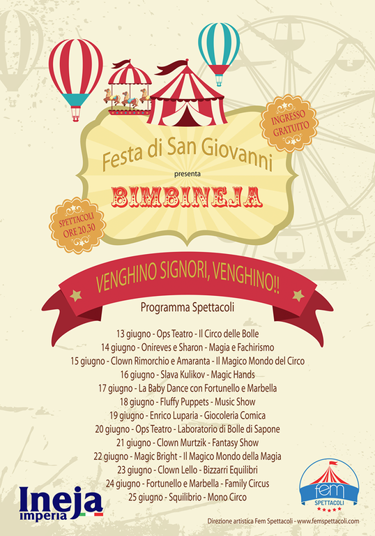 Ogni serata prevede un programma per grandi, piccoli e famiglie. BimbIneja è pronto ad accogliere i bambini nell'area sottostante la ruota panoramica per musica, balli, giochi e magia: questa sera alle 20.30 “giocoloreia comica” con Enrico Luparia. La serata di oggi propone inoltre: alle ore 19.30 dimostrazioni ludico-sportive con l'associazione Fudoshin Karate di Imperia; alle 21.15 “Ballando sotto le stelle” con DJ Tex fino a tarda notte, con intermezzo di Geisa Rodriguez della scuola Onda Cubana di Sanremo.