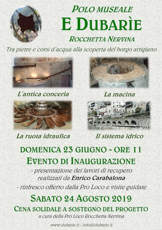 Il polo museale sarà poi aperto tutti i sabati, le domeniche e i giorni festivi dalle 10 alle 18. Info su www.dubarie.it o sulla pagina Facebook “E Dubarie - Rocchetta Nervina”