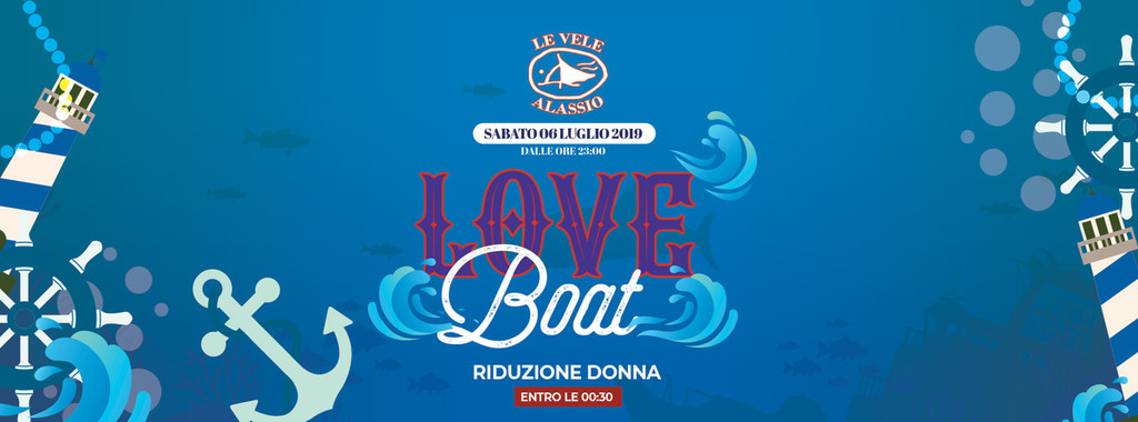 Questo sabato Le Vele Alassio presenta il terzo di sei appuntamenti con i parties a tema della stagione estiva 2019! Immergiti nel magico scenario marinaresco del "Love Boat", sicuramente la festa più rappresentativa del mondo de Le Vele Alassio! L'ingresso è in riduzione per le donne entro le ore 00:30 e ridotto tutta la notte per i possessori della Resident Card. Arrivate presto, fate festa insieme a noi e aspettiamo l'alba insieme!