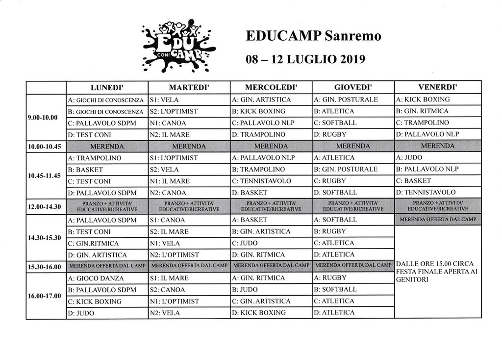 Ritorna anche quest'anno l'appuntamento con l'Educamp Coni a Sanremo. Le società Nuova Lega Pallavolo e Ginnastica Riviera dei Fiori hanno aderito al progetto nazionale del Coni per il campus estivo multidisciplinare che si terrà a Sanremo dall'8 al 19 luglio.