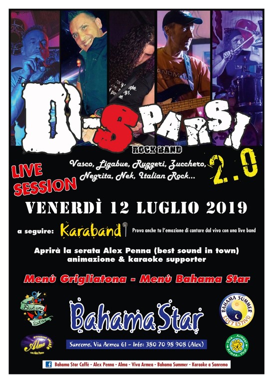 Si ricorda infine, che venerdì 12 luglio ci sarà una live session dei D-Sparsi sulle note di Vasco, Ligabue, Ruggeri, Zucchero, Negrita, Nek, Italian Rock e molto altro ancora. A seguire Karaband, un format ormai diventato famoso al Bahama Star, dove il pubblico potrà esibirsi dal vivo insieme alla band. Ideato dal tastierista dei D-Sparsi Marco La Moglie e Alex Penna, il Karaband mette alla prova le capacità canore dei partecipanti e rappresenta un vero test per accedere al mondo della canzone.