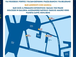 Le vie interessate all'iniziativa saranno: via Ospedale, Galleria Berio, Galleria degli Orti, via Vieusseux, i Portici di via Bonfante, via San Giovanni, Piazza Bianchi e via Belgrano. Alla manifestazione aderiranno il bar Cicò con il gruppo musicale “Il Premiato Cotonificio”; il Bacan con la band “The Frade”; Dolcezze in Galleria con “Alessandro Sapiolo”; Basilio con “Mauro Vero” e Pianetà Caffè con i “Nota Bene”.