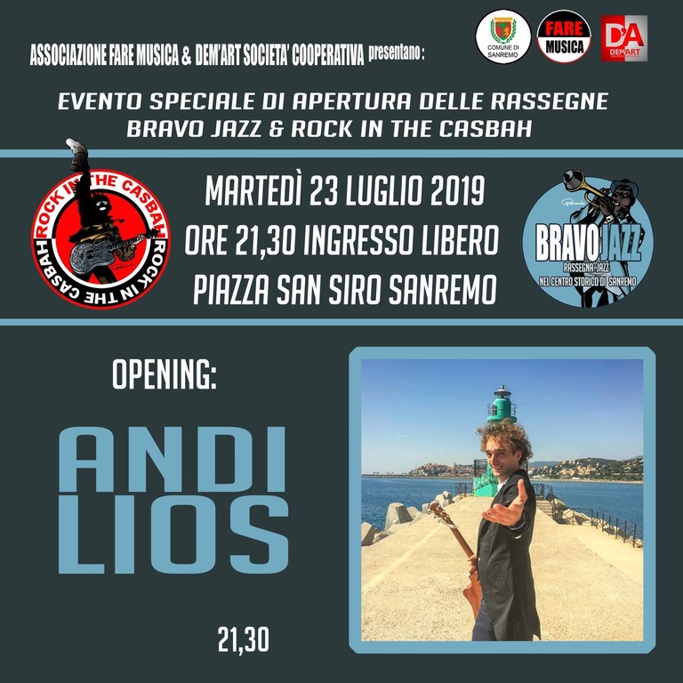 L’associazione “Fare Musica”, storica organizzatrice delle rassegne di successo ‘Bravo Jazz’ (co organizzata con la cooperativa Dem'ART) e ‘Rock in the Casbah’, lo ha adottato artisticamente e gli affiderà un ruolo cruciale nel calendario estivo 2019. Andi Lios, martedì 23 luglio, suonerà sul palco di piazza San Siro per aprire le settimane delle due manifestazioni di punta di “Fare Musica”.
