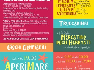 La manifestazione organizzata con il patrocinio del Comune di Ventimiglia, sarà allietata dalla musica itinerante della “ Orchestra Filarmonica Giovanile -Città di ventimiglia”, da animazione e giochi per bambini, dalle 9.30 alle 10.00, dalle 11.30 alle 12.00, per poi riprendere dalle 17.30 alle 18.30.