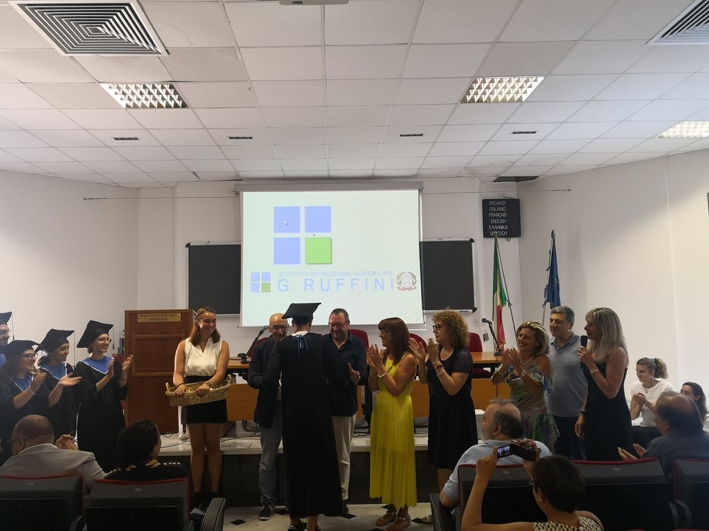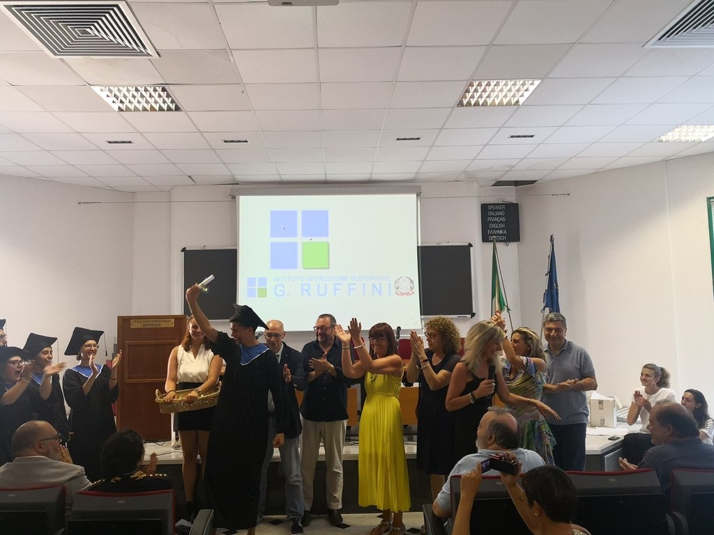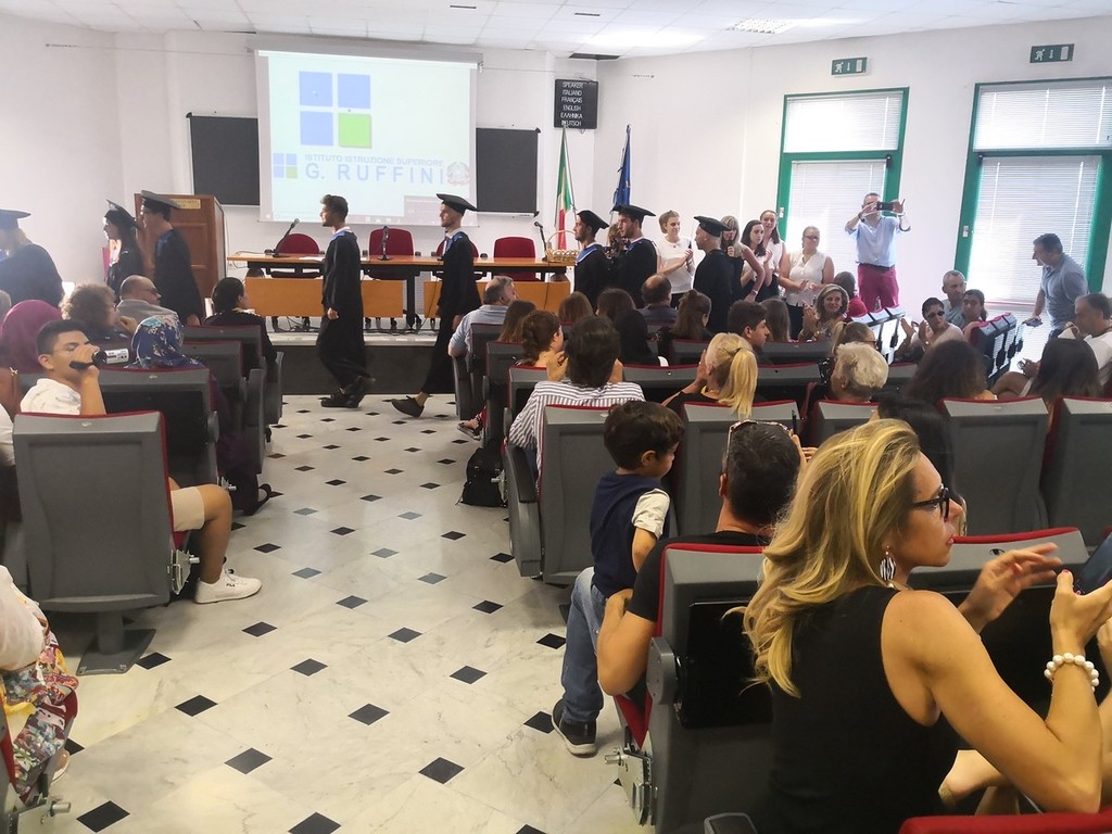 Si è svolta questa mattina, in un aula magna del presidio universitario imperiese gremita, l'ormai tipica cerimonia del lancio del tocco per i diplomati dell'Istituto Ruffini e tecnico turistico Hanbury. Presenti i vertici scolastici, compreso il provveditore Luca Lenti, Giorgio Giuffra e il presidente Domenico Abbo in rappresentanza della Provincia di Imperia e la dottoressa Benedetta De Filippi per la Questura di Imperia.