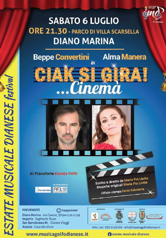 21.30. ‘Ciak si gira!’: concerto spettacolo con Alma Manera e con la partecipazione dell'attore Beppe Convertini, nell'ambito della tradizionale rassegna estiva ‘Estate Musicale Dianese’, giunta alla 8a edizione. Villa Scarsella (a pagamento), info 338 1118108