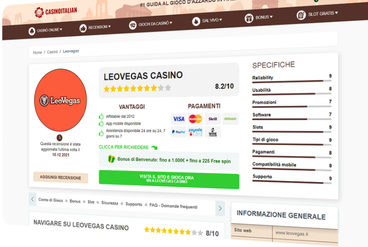 La prima cosa che noti quando visiti Casinoitalian.online è la pagina principale, che è una sorta di presentazione della piattaforma e del gioco d'azzardo in generale in Italia. Scopri come funzionano i casinò online nel nostro Paese, come iniziare a giocare, quali bonus vengono offerti e quali tipi di giochi sono disponibili.