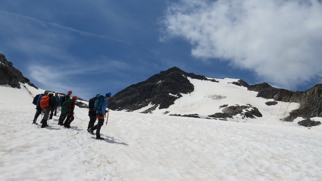 Lì, in un ambiente confortevole e accogliente, il gruppo si è riposato e ha ricaricato le energie in vista del giorno seguente. Domenica mattina la sveglia è suonata alle 5 e dopo una breve colazione i partecipanti sono partiti verso la punta d'Arbola. Dopo aver percorso un lungo tratto di sentiero, e due laghi, il Vannino e lo Sruer, siamo giunti al Passo del Vannino 2754 metri, dove incomincia il grande ghiacciaio del Sabbione. Una volta indossati i ramponi, l'imbrago e il casco di sicurezza e formate le cordate è iniziata la salita. Il punto più duro, ma soddisfacente della salita è stato sicuramente quello del passaggio per il pendio inclinato di 40/45°, fino a giungere, dopo 5 ore di cammino, alla vetta della Punta d'Arbola.