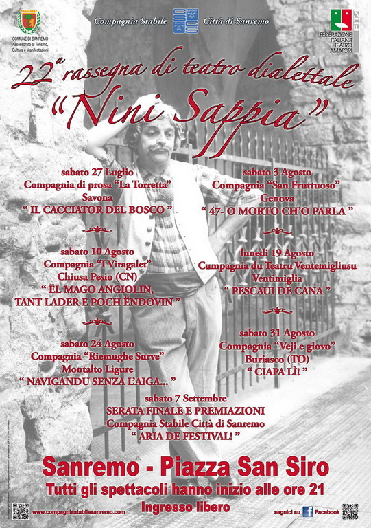 Intitolata a Nini sappia, fondatore e per molti anni colonna portante della compagnia Stabile Città di Sanremo, la rassegna si tiene nell’affascinate cornice di Piazza San Siro, di fronte alla cattedrale, luogo simbolo della comunità di Sanremo.