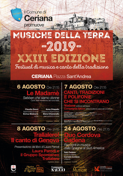 Ceriana, borgo millenario della Valle Armea, da tutti riconosciuto come il paese del canto e delle confraternite, sito nell’immediato entroterra di Sanremo, ospita tra agosto e settembre la 23ª edizione del Festival - Convegno Internazionale Musiche della Terra. La rassegna, promossa dal Comune di Ceriana nasce nel 1997 per stimolare il confronto e lo scambio tra la ricchissima tradizione polivocale cerianasca e le culture dei popoli della terra.