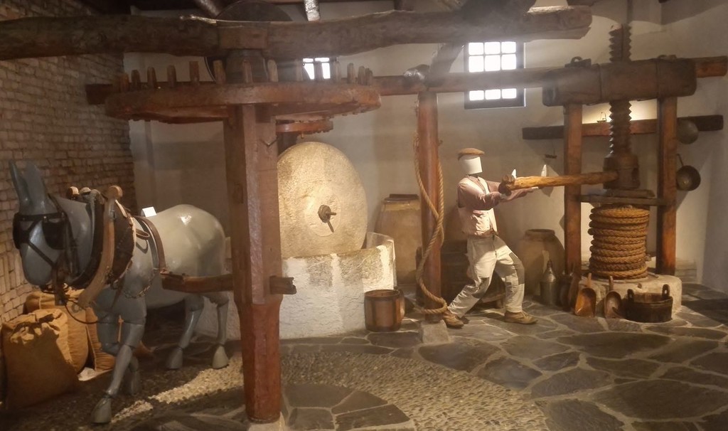 12 - FRANTOIO A TRAZIONE ANIMALE, IL "GUMBU". Una delle ricostruzioni più riuscite del museo mostra il funzionamento del frantoio "a sangue", quello cioè mosso da un animale, di solito un asino. La macina riduceva le olive in una pasta raccolta e sistemata su particolari dischi in fibra vegetale. Questi venivano impilati sotto una pressa e spremuti per far fuoriuscire l'olio. Un sistema semplice ma geniale che venne utilizzato per secoli.