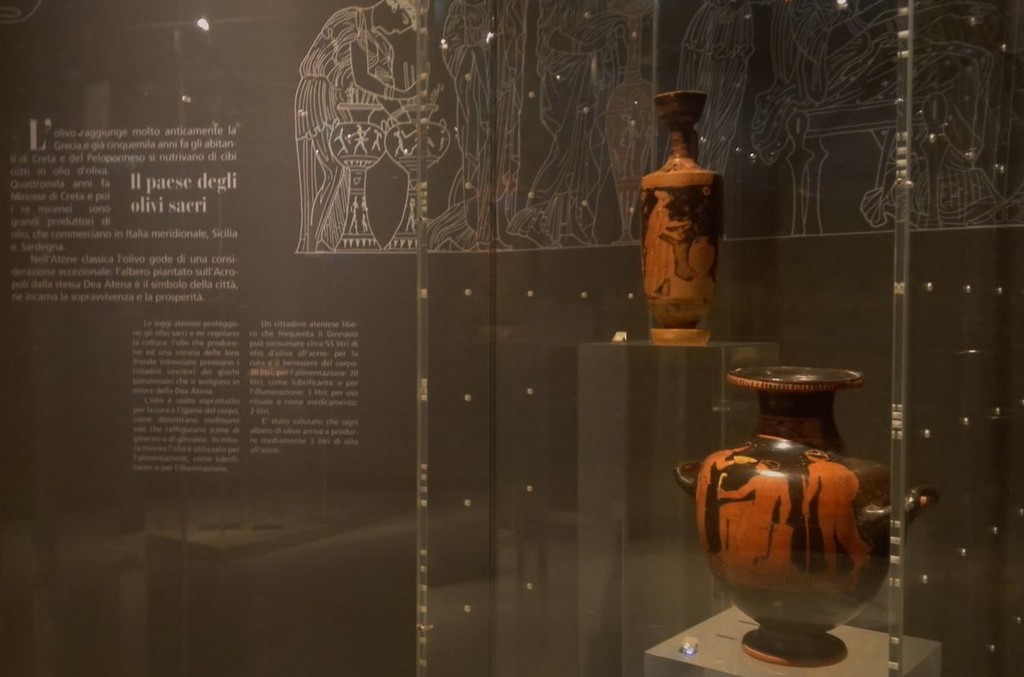 9 - OLIO PER LA BELLEZZA. Si torna a parlare degli usi dell'olio affrontando il tema della bellezza e della cura del corpo, soprattutto al femminile. La maggior parte degli unguenti profumati, saponi, creme dell'antichità era formata da miscele di diversi ingredienti dove un ruolo da protagonista era giocato proprio dall'olio di oliva. I contenitori esposti sono di una raffinatezza davvero unica. Un vasetto egiziano in diorite usato per gli unguenti risale addirittura all'Antico Regno, tra il 2000 e il 3000 avanti Cristo!