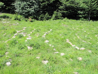 “Nel giugno 2018 l’amico Damiano Taggiasco mi segnalava su Google Earth la presenza di una strana struttura in alta Valle Argentina identificabile come un labirinto realizzato con pietre. L’otto luglio dello stesso anno ci siamo recati nella località dove risultava essere la struttura al fine di verificarne la natura. Il ‘labirinto’ si trova a poche centinaia di metri di distanza dal Passo della Mezzaluna sopra Rezzo, disposto su un pendio in prossimità di una pietraia poco sopra il sentiero che appunto porta verso il passo. E’ costituito da molte pietre di piccole dimensioni (30, 40 cm) prelevate dalla pietraia vicina ed allineate a formare un disegno a ‘labirinto’ con diametro di circa 18 metri".