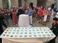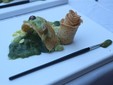 Un mix di colori e sapori, delicato ed equilibrato, dove una fetta di pane artigianale rappresentava la figura del ponte coperto da una velo di Brandcujun e olive taggiasche, due passioni del maestro, su una crema di erbette di campo condita con olio EVO e impreziosita da un richiamo medievale rappresentato dalla cipolla egiziana. Il ricordo della passione di Monet per i fiori è stato affidato alle foglie di Nasturzio, dell'azienda Ravera bio di Albenga, che hanno aggiunto un raffinato tocco speziato al piatto, che è stato apprezzato ed applaudito da tutti gli invitati.