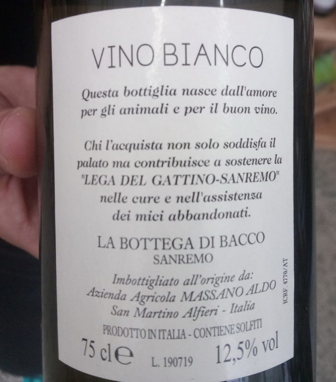 Parte del ricavato della vendita del vino ‘Venerdì’ andrà alla ‘Lega del Gattino’ di Sanremo, che salva e cura gattini piccoli abbandonati e di cui Francesca è la presidente. Il vino ‘Venerdì’ si trova da ‘Bacco’, in via Agosti a Sanremo, prima del Conad.