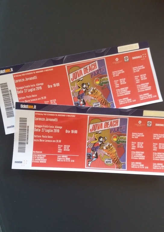 Per questo motivo, dopo la cancellazione della data di Albenga, un privato vende due biglietti regolarmente acquistati su TicketOne lo scorso dicembre – prima del sold out – validi anche per la festa finale del grande tour estivo di Jovanotti: costo di entrambi i biglietti euro 140. Sarà possibile fare richiesta per l'acquisto dei biglietti entro il 18 agosto.