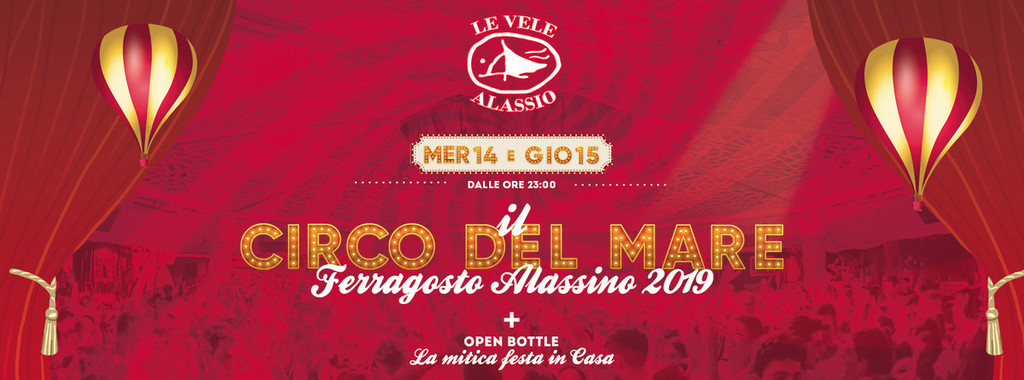 Le Vele Alassio presenta "Ferragosto Alassino 2019"! Come da tradizione vi aspettiamo per festeggiare insieme il Ferragosto in Riviera ligure di Ponente: Mercoledì 14 con la grande festa a tema "Il Circo del Mare" e Giovedì 15 con la mitica "Festa in Casa"! Arrivate presto, fate festa insieme a noi e aspettiamo l'alba insieme!