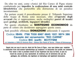 “Credo sia necessario specificare che era già stata attuata un'iniziativa analoga dove erano stati raccolti circa 7000 euro, in parte utilizzati per spese legali che ci hanno permesso di arrivare alla famosa conferenza dei servizi ove la provincia ha annullato l'Autorizzazione Unica alla Remna, in parte per un rendering fotografico ed in buona parte utilizzati come donazione al Comune di Pigna per sostenere le notevoli spese legali visto che la società Remna ha portato al Tribunale Superiore delle Acque di Roma tutti gli Enti che si sono contrapposti al Progetto della Minicentrale sul Rio Carne. Tutte le spese sostenute sono documentate da fatture e dalla delibera comunale che attesta la donazione di 5000 euro".