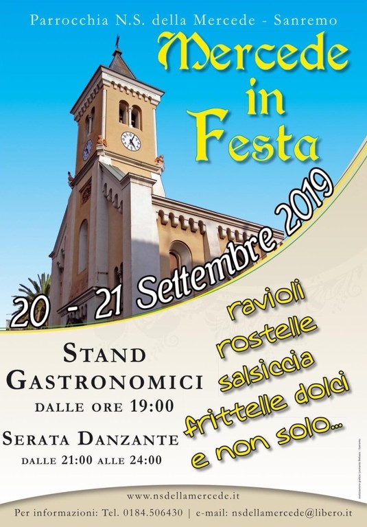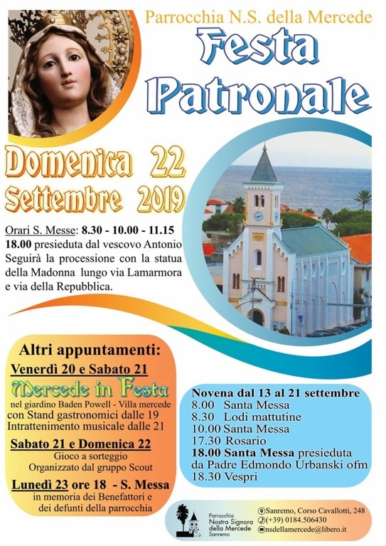 Si avvicina un periodo ricco di eventi per la Parrocchia e per tutto il quartiere di San Martino in Sanremo. Il 22 settembre verrà festeggiata Nostra Signora della Mercede, la Santa patrona, e le funzioni domenicali rappresenteranno il culmine della festa , con la celebrazione delle Sante Messe.