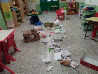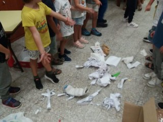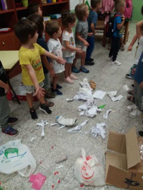 Ieri pomeriggio all'arrivo in classe i bimbi hanno trovato nell'aula un cestino rovesciato, carta e cartacce sparse: una ricostruzione di quanto potrebbero trovare in qualsiasi strada delle loro città, se non curata a dovere. Le reazioni sono state di sorpresa, stupore e dubbio ma soprattutto di voglia di rimettere tutto a posto e di “aiutare la terra ad essere più pulita”.