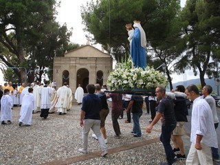 La riapertura è stata celebrata insieme ad un'altra ricorrenza importante: i 70 anni dal pellegrinaggio votivo della Madonna nel Ponente Ligure. Da quest'oggi la statua della Madonna Pellegrina è tornata nel Santuario, sua originale collocazione e lì portata in processione dalla comunità al termine della Santa Messa Solenne officiata da Mons. Antonio Suetta, vescovo della Diocesi di Ventimiglia San Remo. La banda P.S. Rambaldi, ha accompagnato il lungo fiume di fedeli accorsi che dopo aver assistito alla funzione hanno portato la Madonna Pellegrina dalla Chiesa di San Sebastiano fino al Santuario. Al termine della cerimonia, all'interno della chiesetta il Vescovo ha ringraziato i benefattori e tutti coloro che hanno contribuito al restauro.