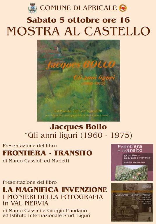 Sabato 5 ottobre alle ore 16.00 sarà presentata nel salone del Castello di Apricale la mostra di Jacques Bollo, postimpressionista italo-francese, dal titolo 'Gli anni liguri 1960-1975'.