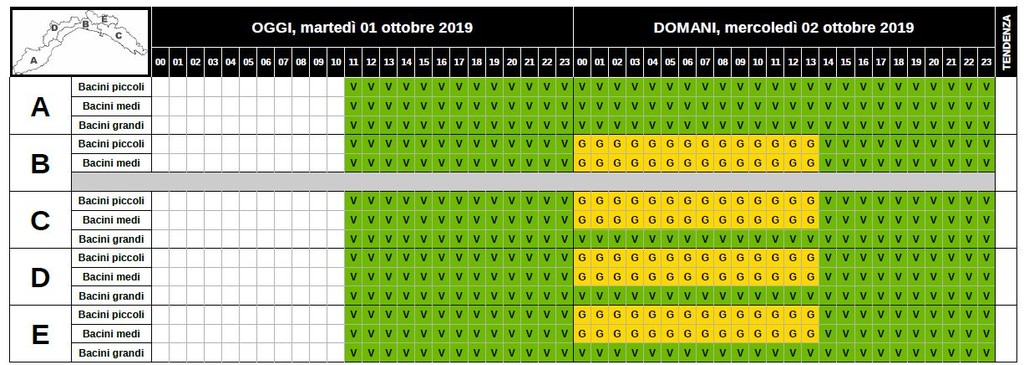 DOMANI, MERCOLEDI’ 2 OTTOBRE: l'arrivo di un fronte dalla Francia porta dalle prime ore della notte piogge diffuse in estensione da Ponente verso Levante di intensità anche moderata su BCE, dove le cumulate raggiungeranno valori significativi. Le piogge saranno accompagnate da rovesci e temporali forti, la cui probabilità sarà alta su BCE e parte orientale di D. Precipitazioni in esaurimento a partire da Ponente dalle ore centrali. Segnaliamo al mattino raffiche di vento da Sud, Sud-Ovest attorno ai 50-60km/h sui crinali e sui capi di A; mare molto mosso da pomeriggio su C.