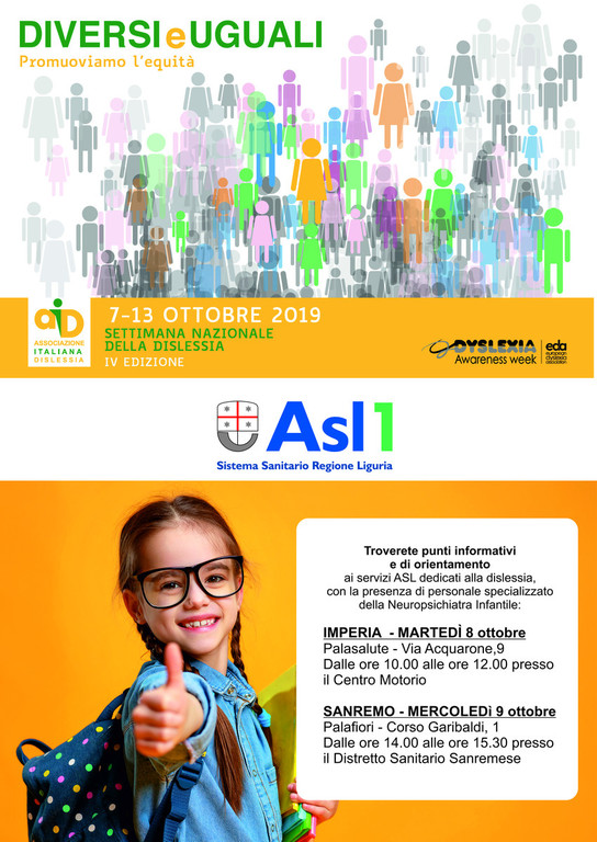 In occasione dell’edizione 2019 della Settimana della Dislessia, l’ASL 1 aprirà dei punti informativi dedicati dove sarà possibile ricevere indicazioni e orientamento ai servizi ASL dedicati alla dislessia, con la presenza di personale specializzato della Neuropsichiatra Infantile.