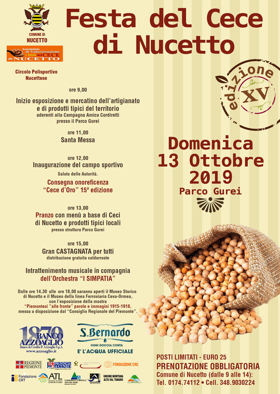La festa del Cece è la nostra festa perché riesce a coinvolgere tutte le forze vive del paese, in un bell’esempio di coesione e di amicizia. Tanto è per l’associazione di valorizzazione e tutela del cece, per il circolo polisportivo, per il gruppo di protezione civile e per l’associazione storico culturale La Marina. Ed è anche cultura questa festa, infatti grazie proprio alla Marina proponiamo nell’area museale anche una mostra itinerante del Consiglio Regionale del Piemonte sul tema della Grande Guerra.