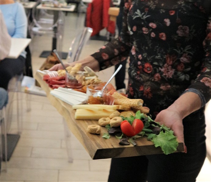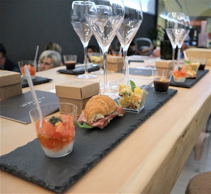 I due vini sono stati accompagnati da una degustazione preparata dallo staff di Camillo che prevedeva: Caprese finger food; mini-Brioches artigianale con speck e rucola; CousCous vegetariano; Polipetti in guazzetto e Bonet con granella di amaretto.