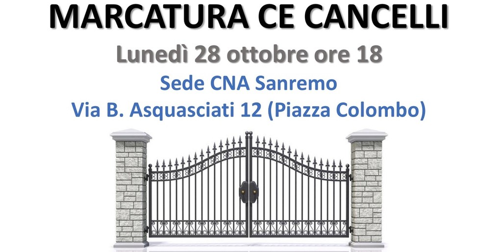 Lunedì 28 ottobre, CNA organizza un incontro informativo su Marcatura CE per i cancelli automatici, presso la sede territoriale CNA di Sanremo, in via B. Asquasciati 12 (Piazza Colombo). La serata si rivolge a carpenterie, fabbri e serramentisti che installano e producono cancelli e portoni. Sarà offerta una panoramica aggiornata del ventaglio normativo specifico e le responsabilità dei produttori ed installatori.