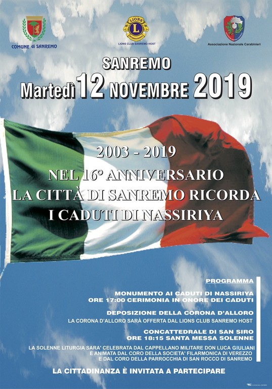 Alle 17, al Monumento ai Caduti di Nassiriya, sono previste la cerimonia in onore dei Caduti e la deposizione di una corona di alloro (sarà offerta dal Lions Club Sanremo Host) Alle 18.15, nella Concattedrale di San Siro, si svolgerà la Santa Messa Solenne. La solenne liturgia sarà celebrata dal Cappellano Militare Don Luca Giuliani e animata dal coro della Società Filarmonica di Verezzo e dal coro della parrocchia di San Rocco di Sanremo.