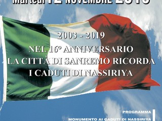Martedì 12 novembre la città di Sanremo ricorderà i Caduti di Nassiriya nel 16° anniversario. Sono passati tanti anni ma è ancora vivo il ricordo di quell'attentato del 2003, quando un camion bomba esplose davanti alla base MSU (Multinational Specialized Unit) italiana dei Carabinieri. Quel giorno morirono 28 persone.