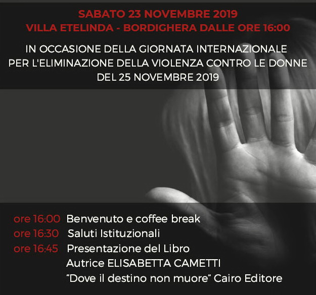 Importante appuntamento, sabato 23 novembre alle 16 a Villa Etelinda di Bordighera. In occasione della giornata internazionale per l’eliminazione della violenza contro le donne (fissata per il 25 novembre), si svolgerà la presentazione del libro di Elisabetta Cametti ‘Dove il destino non muore’ (Cairo editore).