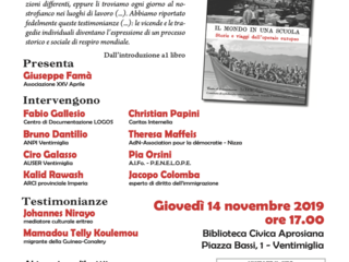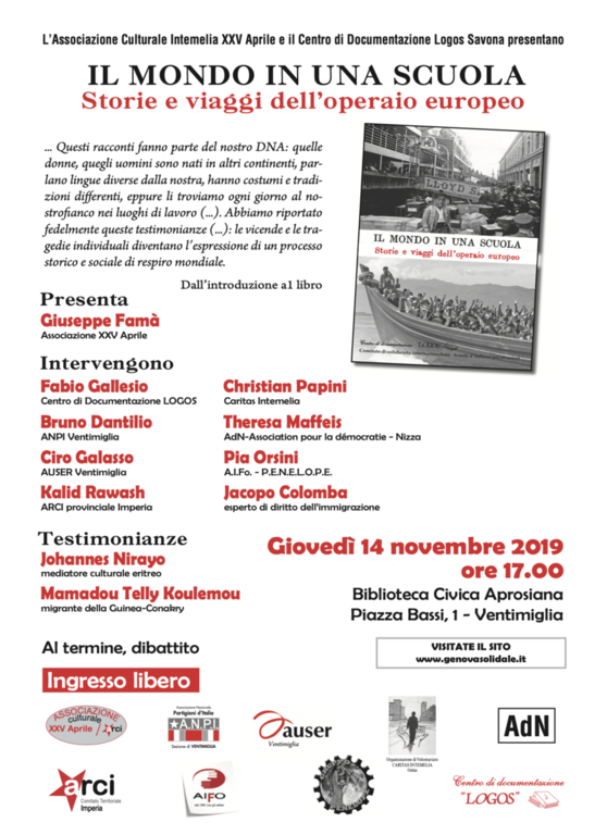 Sarà presentato oggi pomeriggio alle 17 alla Biblioteca Civica Aprosiana di piazza Bassi 1, a Ventimiglia, il libro “Il mondo un una scuola”. L’incontro pubblico è organizzato dall’Associazione culturale XXV Aprile di Ventimiglia e dal Centro di Documentazione Logos di Savona.
