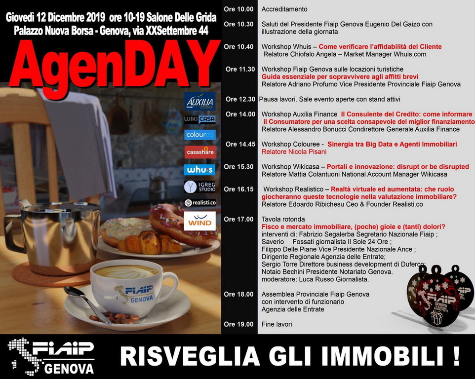 Ad intervenire il Presidente di FIAIP GENOVA, Eugenio Del Gaizo: “Si tratta ormai della quarta edizione della giornata dedicata agli Agenti Immobiliari denominata "AgenDay" e, per la prima volta, quest'anno è aperta a tutti con ingresso libero! – afferma - Per i colleghi che operano nel settore sarà un'occasione importante per approfondire i vantaggi di essere associato alla più rappresentativa ed attiva federazione di A.I., per scambiare esperienze con i colleghi presenti e per meglio comprendere in che direzione si sta evolvendo il mercato immobiliare”.