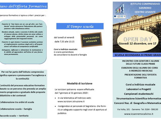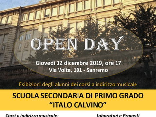 La Scuola Secondaria di primo grado “Italo Calvino”, dell’Istituto Comprensivo Sanremo Centro Levante, sarà lieta di accogliere Genitori ed Alunni delle future prime Giovedì 12 Dicembre 2019 alle ore 17 per presentare l’offerta formativa per l’anno scolastico 2020/21.