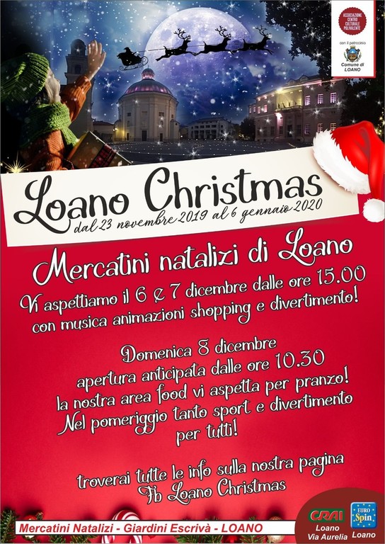 Il Mercatino di Natale gode del Patrocinio del Comune di Loano. Un ringraziamento particolare, infine, al main sponsor dell’evento: Doppia-J supermercati Crai (via Aurelia, zona Excelsior) ed EuroSpin (via Aurelia, zona Tennis Club) Loano.