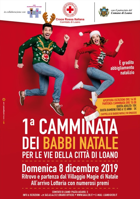 Ancora domenica 8, dalle 15, la prima “Camminata dei Babbi Natale per le vie di Loano” con partenza dai mercatini h15.30. Un importante evento di solidarietà organizzato dalla Croce Rossa Loano in collaborazione con ASD Runners for Autism.