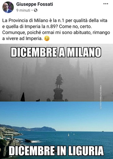 “La Provincia di Milano è la n.1 per qualità della vita e quella di Imperia la n.89? Come no, certo. Comunque, poiché ormai mi sono abituato, rimango a vivere ad Imperia”, ha commentato Fossati che ha postato un’immagine di Milano ricoperta dalla nebbia, e un’altra di un paesaggio di mare ligure.