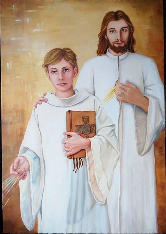 Monica Giussani “ringrazia per l’opportunità di aver potuto esprimere attraverso la sua arte il concetto espresso nella frase citata: non è possibile portare l’abbraccio di Dio agli altri se prima non lo si sperimenta su di sé”. L’artista raccontando la realizzazione dell’opera tiene a dire: “Cerco sempre di esprimere in modo profondo i concetti delle mie opere. In questo quadro Gesù abbraccia un ragazzo mentre dal Suo cuore escono i raggi della Misericordia e attraversano il giovane per poi fuoriuscire dalla sua mano, verso gli altri, il prossimo. Solo in questo modo possiamo amare gli altri dello stesso Amore di Dio. La scelta dei colori aiuta, chi guarda il quadro, a sentire il calore dell’abbraccio”.