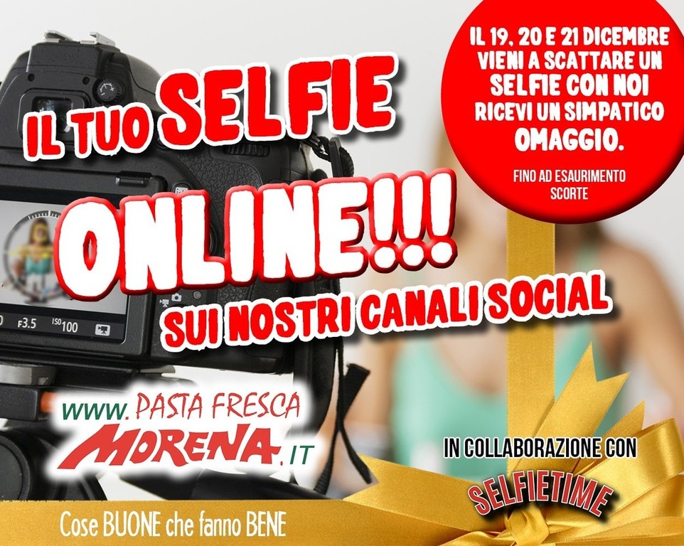 In occasione delle festività natalizie, Pasta Fresca Morena sta organizzando un grande evento presso il punto vendita di Via Aprosio 21/c Ventimiglia. Nelle giornate di giovedì 19, venerdì 20, sabato 21 dicembre in collaborazione con 'Selfietime' verranno installati in negozio 2 maxischermi, una telecamera, una stampante e un collegamento internet; con la possibilità di scattare i vostri selfie e ritrovate le vostre foto direttamente su tutti i canali social del noto pastificio oltre ad avere la stampa.