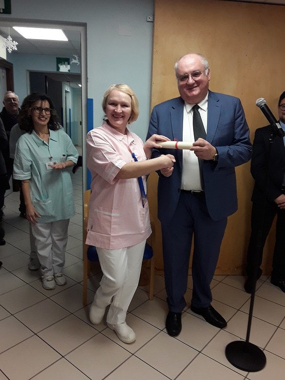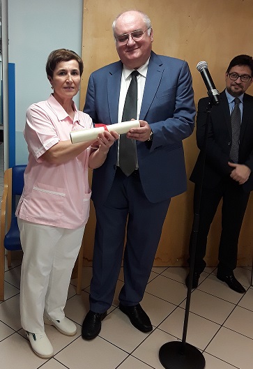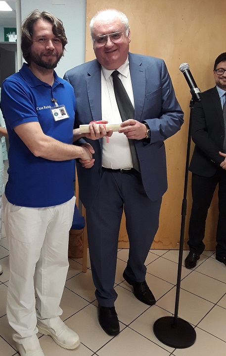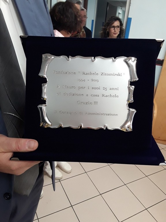 All’offertorio sono stati consegnati da alcuni operatori della Casa i fiori come espressione di gioia e festa, un’immagine con le mani a simbolo dell’accoglienza nei confronti degli Ospiti e i riconoscimenti dell’attività agli operatori: diploma e spille da appuntare alla divisa. La Fondazione ha riconosciuto per la dedizione al lavoro, nella RSA Casa Rachele, per i 5 anni consecutivi a Guido Giordano e per i 10 anni Iuliana Reta Ciobanu, Irina Mulgacheva e Gianluca Morelli, accolti dagli intervenuti con un grande applauso, a testimonianza dell’apprezzamento per coloro che, con dedizione, operano quotidianamente a Casa Rachele, dedicando il loro tempo alle attività della struttura.