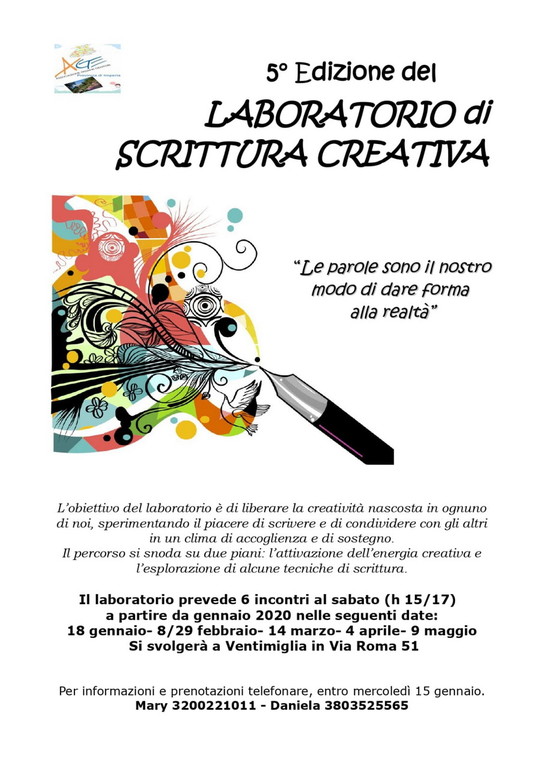 Sabato 18 gennaio 2020, dalle ore 15 alle ore 17 a Ventimiglia, partirà la 5a edizione del Laboratorio di Scrittura Creativa.