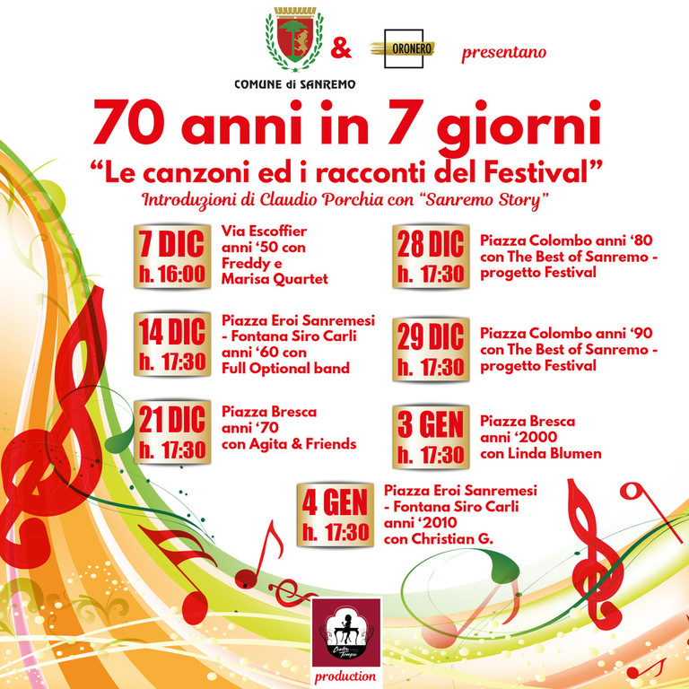 La rassegna “70 anni in 7 giorni”, voluta dal Comune di Sanremo - Assessorato al Turismo e Manifestazioni , organizzata dall’associazione OroNero, con la produzione di Simona De Melas, ripercorre la storia della manifestazione musicale con la riproposta delle canzoni più famose intrecciate con gli aneddoti e i racconti di Claudio Porchia, autore del libro “Sanremo Story”, il libro edito da Zem edizioni sui retroscena del Festival ed impreziosito dalla prefazione di Bruno Gambarotta.