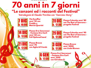 La rassegna “70 anni in 7 giorni”, voluta dal Comune di Sanremo - Assessorato al Turismo e Manifestazioni , organizzata dall’associazione OroNero, con la produzione di Simona De Melas, ripercorre la storia della manifestazione musicale con la riproposta delle canzoni più famose intrecciate con gli aneddoti e i racconti di Claudio Porchia, autore del libro “Sanremo Story”, il libro edito da Zem edizioni sui retroscena del Festival ed impreziosito dalla prefazione di Bruno Gambarotta.