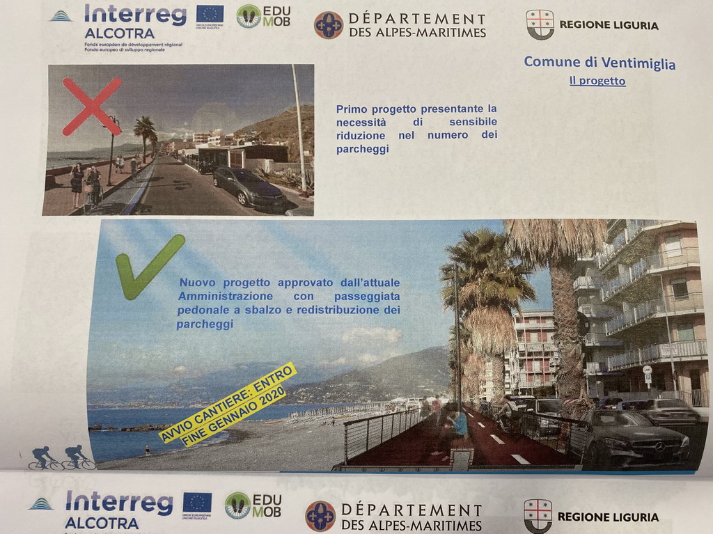• progettazione e realizzazione di piccole tratte di pista ciclabile. In Liguria il progetto interessa i Comuni di Ventimiglia, Vallecrosia e Bordighera, in Francia i Comuni di Mandelieu e Villeneuve Loubet e Sophia Antipolis.